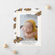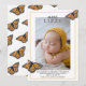 ¿Vas a llamar a tu recién nacido con un apodo? ¡Entonces esta tarjeta puede presumir! ¡Celebra y anuncia tus mayores noticias con estas hermosas tarjetas mariposas! ¡Comparte tu feliz noticia con la familia y amigos y muestra tu estilo! La carta muestra el arte de una mariposa monarca revoloteando cariñosamente alrededor de una foto retrato de tu dulce recién nacido! En la superposición de texto se lee: "Conozca (nombre del bebé)", una manera perfecta de agregar el apodo o nombre que planea llamar a su hijo si es diferente de su nombre completo. Debajo de la foto, hay mucho espacio para el personalizar con el nombre completo de su bebé, estadísticas de nacimiento o cualquier información que le gustaría incluir. En la parte trasera hay un bonito patrón de arte mariposa en la parte delantera.