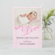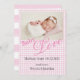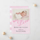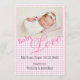 Tipografía y escritura de "Baby Love", dulce y chica, con manchas rosadas en la parte delantera y color de agua rosada en el reverso. Área para la foto del recién nacido. Añade el nombre del bebé y a los padres orgullosos y tienes un adorable anuncio de nacimiento para "presentar a tu dulce bebé". ¡Enhorabuena!