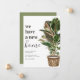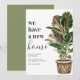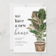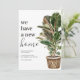 Tarjeta de anuncio de mudanza moderna con un fondo blanco simple, una planta de casa pintada a mano de estilo rústico, el dicho 'tenemos un nuevo hogar', y su nueva dirección.