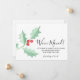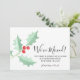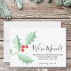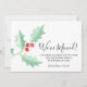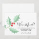 Está decorada con acebo de acuarela y bayas en tonos rojos y verdes y tipografía script.