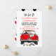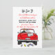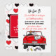 Antiguo coche convertible con novios y letrero de recién casados con latas colgando de la parte trasera de su coche alejándose después de la invitación a la fiesta.
