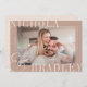 Comparte la noticia de tu compromiso con estas elegantes tarjetas de anuncio que presentan una foto horizontal o apaisada con sus nombres alineados en las esquinas en letra clásica, superponiendo ligeramente su foto y extendiéndose más allá de los bordes del papel para un look moderno. Personalice con dos líneas de texto personalizado a lo largo de los lados para obtener detalles adicionales o su sitio web de boda.