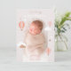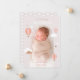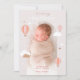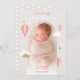 Anuncio de nacimiento de una niña recién nacida con globos de aire caliente, nubes y estrellas con acentos de Relieve metalizado falsos que crean un arco sobre la foto del bebé. Los colores son rosados.