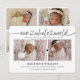 Tarjeta de anuncio de nacimiento chic y moderna con 2 fotos en la parte delantera y 4 fotos en la parte posterior de la tarjeta. Escritura "nuestro mundo entero" vinculada con corazón. Tipografía moderna y clásica.