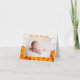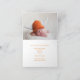 Esta hermosa y moderna tarjeta de foto de recién nacido de Acción de Gracias presenta una fotografía de tu dulce bebé bajo las palabras Nuestro pequeño calabaza en naranja. Esta bonita fotografía otoñal con madera blanca de moda detrás del parche de calabazas es una elegante tarjeta de anuncio de nacimiento para Halloween o Día de Acción de Gracias.