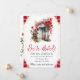 Magnífica acuarela roses rojos floral diseño de puerta de primavera con confeti purpurina dorado sobre fondo blanco