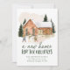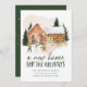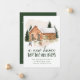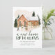 Elegante invitación de vacaciones en movimiento con una acogedora casa de ladrillo acuático rodeada de pinos iluminados con nieve, con dos personas construyendo un muñeco de nieve delante. "A New Home For The Holidays" se muestra con letras de color verde oscuro. Personalice el diseño con su nombre y dirección. La tarjeta se revierte a un fondo verde oscuro nevado.