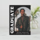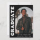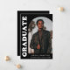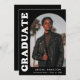 Invitación de graduación elegante y de moda que presenta la foto del graduado en la parte delantera con un marco fotográfico en arco de desvío. "Graduado" se muestra en negrita con letras retro blancas en un fondo negro. Personalice la parte delantera de la invitación de graduación de fotos en arco agregando el nombre del graduado, la escuela y el año de graduación. La tarjeta se revierte para mostrar otras 3 fotos con espacio para texto personalizado como futuros planes universitarios, planes de carrera, detalles de la fiesta de graduación, etc. La invitación de graduación negra es perfecta tanto para graduados de secundaria como universitarios.