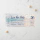 Una boda de destino de la playa con pasaje de embarque para el vuelo de avión salva la tarjeta de cita con una hermosa puesta de sol en una playa de arena oceánica con aguas turquesas. Haga clic en "Personalizar" para salir del diseño de forma avanzada, como cambiar el color del texto, el tipo de letra y la posición, y el fondo de la tarjeta y el color del avión. Contáctame para coordinar los elementos que estás buscando, o usa el "transferir este diseño" para crear el tuyo en cualquier elemento de Zazzle.