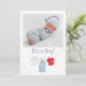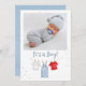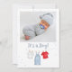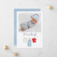 Celebra la llegada de tu pequeño con esta invitación de fotos de niños con un diseño de acuarela tierno y caprichoso. Los suaves tonos azules y el encantador arte de la ropa crean el telón de fondo perfecto para tu fotografía recién nacida. Con su acento azul denim y detalles juguetones, esta invitación de bebé es una manera reconfortante de compartir su alegría con amigos y familia.