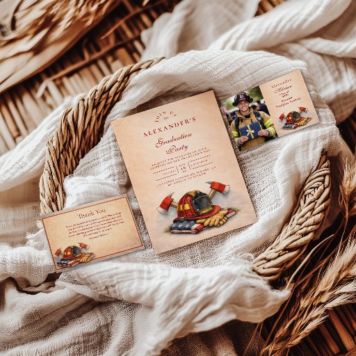 A bold firefighter graduation design featuring classic ceremonial elements, rich red and charcoal tones, and a traditional laurel frame symbolizing achievement and service. The illustrated helmet, turnout gear, and badge create a proud, respectful look perfect for honoring a firefighter’s milestone moment. Ideal for academy graduations, promotions, and first responder celebrations with a timeless, dignified style.