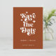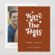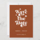 Modern Retro Typography Photo Wedding Announcement Flat Card. With a modern retro typography "save the date" over a terracotta brown background on the front, with names and date in a simple and minimal design, add your wedding website for event details. Add a photo of the couple along with text template for a wedding website or details. Choose prints and/or a digital announcement download.