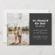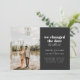 Si cambiaste la fecha de tu boda, pero decidiste que no podías esperar para casarte y te fugaste en su lugar, comparte la gran noticia con tus seres queridos con este anuncio de fuga. Cuenta con letra blanca sobre un fondo de pizarra con espacio para una sola foto y los detalles sobre tu fuga. La parte trasera de la tarjeta tiene espacio para un mensaje personal.