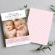 Anuncia a tus niñas gemelas con esta dulce tarjeta de anuncio de nacimiento con la foto de "Presentamos a Nuestras Gemelas". Una foto de recién nacidos se muestra encima de dos bloques de nombres rosados a juego con el nombre de cada bebé, hora de nacimiento, peso y longitud, conectados por un acento de corazón gris. La parte trasera presenta un patrón de franjas diagonales rosadas y blancas. Todo el texto y los colores son totalmente personalizables.