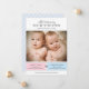 Anuncia a tus gemelos niño y niña con esta elegante tarjeta de anuncio de nacimiento de "Presentando a nuestros gemelos". Una foto de recién nacido se muestra encima de bloques de nombres rosas y azules que muestran el nombre de cada bebé, hora de nacimiento, peso y longitud con un acento de corazón gris entre ellos. La parte trasera presenta un patrón de franjas diagonales rosa y azul coordinado. Todo el texto y los colores son totalmente personalizables.