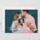Foto Superposición Pronto será Invitación de embarazo de tres Personalizados. Entrega las grandes noticias para que tu nuevo miembro de la familia esté en camino con una tarjeta de foto personalizada con tu propia foto y un guión superpuesto Pronto serán tres y texto personalizado en el frente. La parte posterior es un diseño geométrico x moderno en mostaza y blanco.