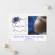 La invitación de embarazo con una flor púrpura de un muñón de bebé. Audaces brotes de flores azules violetas y tipografía azul violeta contra un fondo blanco.