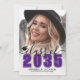 Classic Modern Graduation Announcement. The front features a full-page photo with a white gradient at the bottom that fades seamlessly into the image. Over the gradient, "2026" appears in a bold purple classic school-style font. Just above it, "Class of" is written in elegant black script. To the left of the year is a small, customizable graduation cap icon. Below the year, the graduate's name and school name are prominently displayed. All colors can be customized to match school colors or personal preferences.