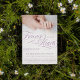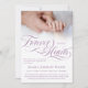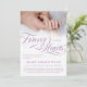 Invitación conmemorativa del bebé que puedes personalizar con una foto. Para siempre en nuestros corazones escrito en un suave matiz de morado. Añade el nombre y las estadísticas de nacimiento de tu ángel junto con información sobre un servicio. En la parte de atrás puedes añadir una oración o un poema para honrar a tu amado ángel.