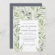 Nuestro hermoso diseño botánico en acuarela es el telón de fondo para los detalles de su boda en esta excelente tarjeta de anuncio. Los tonos suaves del follaje de olivo verde dan un toque clásico atemporal al diseño que sería apropiado para una boda en cualquier estación. Con fuente elegante para sus detalles.
