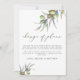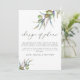 Un diseño elegante para anunciar un cambio en sus planes de boda. Con hermosas ramas de olivos y hojas de acuarela verdes, con un titular "cambio de planes" en caligrafía moderna de color verde oscuro, su mensaje en fuente sans serif gris oscuro, sobre un fondo blanco. El reverso presenta un patrón de olivos y hojas de acuarela negras y verdes.