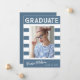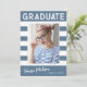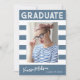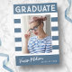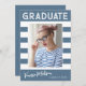 Fotos de invitación de graduación a rayas y retro de moda, con elementos de diseño de texto retro con escritura a mano. La foto de los graduados está acentuada con audaces rayas blancas. La parte posterior de la tarjeta ofrece espacios de texto personalizados para obtener información sobre su graduación y viaje futuro. Escribir en blanco sobre moda polvoriento azul o fácilmente personalizar el fondo para que coincida con el color primario de su escuela o cualquier color de su elección. Perfecto para el bachillerato, la universidad y la universidad.