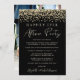 Elegante anuncio de elopamiento o boda privada negra e invitación a la recepción. La parte delantera cuenta con un overlay de confeti de brillo dorado falso y "Fiesta Feliz Después" en tipografía dorada clara simple y un guión dorado claro moderno y chic. Personalice su anuncio e invitación y agregue sus nombres en un guión similar a una firma. La parte trasera cuenta con la foto de su boda, los nombres de pila y la fecha de la boda.