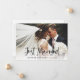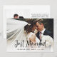 Esta sencilla y elegante tarjeta de anuncio de boda presenta una foto de boda personal en la parte delantera, con las palabras "recién casados" en escritura informal y negra a mano. La parte trasera de la tarjeta tiene espacio para otra foto, además de espacio para detallar los pormenores de la fuga o proporcionar detalles para una recepción o celebración después de la boda. Un diseño elegante que es la forma perfecta de hacer saber a amigos y familiares que están recién casados.
