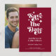 Modern Retro Typography Photo Wedding Announcement Flat Card. With a modern retro typography "save the date" over a burgundy background on the front, with names and date in a simple and minimal design, add your wedding website for event details. On the back is a full-frame photo of the couple. A unique and affordable Wedding Save the Date for couples on a budget. Choose prints and/or a digital announcement download.