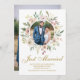 Un elegante marco circular de peonías de color rosa acuarela y rosas crema marfil enmarca este encantador anuncio de foto de recién casados de primavera. Las ramitas botánicas de hojas de eucalipto verde salvia decoran en medio de la variedad de flores durazno sobre la hermosa escritura cursiva. Estas delicadas tarjetas son perfectas para recién casados que tuvieron una ceremonia íntima y pequeña con familiares cercanos durante este tiempo de distanciamiento social. Una hermosa manera para que una novia y un novio les digan a todos que se escaparon.