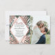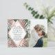 Placas de rosa rosa, verde, blanca y falsa impresión en verano, tropicales y elegantes hojas de palmera sobre un fondo verde de plantación con dibujos geométricos de rosa impreso con recortes de diamante dorado, tarjetas de invitación de compromiso. Este diseño clásico y sofisticado es perfecto para una pareja casera elegante, moderna y elegante. Personalice con su propio mensaje en la parte delantera y un monograma personalizado inicial en la parte posterior. Todo el diseño de impresión fotográfica.