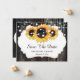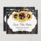 Personalized rustic wood and sunflower wedding save the date cards featuring sunflowers against a barn wood background adorned with string lights. Our rustic floral wedding save the date card is perfect for a rustic country, backyard, garden, or barn wedding party inspired by sunflower flowers.