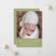 Un simple anuncio moderno de nacimiento para compartir las noticias de su bebé recién nacido. La tarjeta verde sage neutral de género es perfecta para su bebé o chica. Incluye una foto en el frente y la bienvenida en una tipografía blanca. Personaliza con el nombre del bebé, fecha de nacimiento, estadísticas de nacimiento y un mensaje personal de mamá y papá
