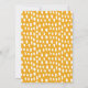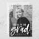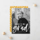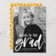 Elegantes y modernos anuncios de graduación que incluyen la foto vertical del graduado con "Saludos al grado" en un guión de broche blanco con letras a mano. Personalice el frente de la invitación agregando el nombre del graduado, el nombre de la escuela y el año de graduación. La invitación de graduación de fotos se invierte para mostrar un patrón de puntos abstractos amarillo-dorado y blanco.