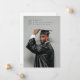 Delante: Una foto de la graduada con un año grande y atrevido (por ejemplo, "2025") en la parte superior izquierda, separada por una línea de la información del graduado, superponiendo con estilo la imagen. Volviendo: una foto más pequeña, con un pequeño mensaje de graduación debajo de la foto.