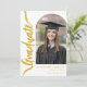Celebre y anuncie la graduación de su hija en la universidad o escuela secundaria con esta impresionante tarjeta de anuncio de graduación con arco de foto de graduado con elegante escritura dorada. Con elegante caligrafía en escritura dorada y una elegante plantilla de foto de graduado en arco, este diseño captura la emoción de nuevos comienzos y celebración alegre. Personalícela con una foto preciada de su graduado utilizando la fácil de usar plantilla de foto, y resalte los detalles del evento con tipografía impresionante. Diseñada por la artista Catherine Sweetman, esta invitación única combina con elegancia el entusiasmo del logro de su hija, lo que la convierte en la forma ideal de reunir a sus seres queridos y marcar este hito especial.