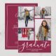 Agrega tus cuatro fotos favoritas en la parte frontal de estas invitaciones para la fiesta de graduación con el graduado y la promoción en elegante letra sobre un fondo de color escolar granate. Haz clic en el enlace Personalizar más para cambiar a cualquier color utilizando nuestras herramientas de diseño. MÁS diseños y colores disponibles en nuestra tienda, incluyendo invitaciones, tarjetas de aviso y postales.