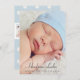Anuncie a su recién nacido a su familia y amigos con estilo con este simple y adorable anuncio de nacimiento de fotos. Presenta una elegante superposición de texto gris carbón (se puede personalizar) en la foto principal, y tres fotos cuadradas en la parte posterior de la tarjeta con texto que se puede personalizar. El fondo de la parte posterior incluye un patrón de puntitos de polka azul y blanco bebé con un aspecto texturado. Utilice la función "personalizar" para editar los colores y la posición del texto.