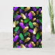 Seamless pattern of bright purple, green, and gold feathers on black Mardi Gras background. Design for the Mardi Gras holiday.