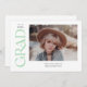 Esta elegante invitación de graduación se caracteriza por el "rizo de la palabra" en un serif de moda verde menta a lo largo del lado izquierdo. La parte delantera tiene espacio para una foto de la graduación, así como su nombre, año de clase y colegio. La parte trasera de la invitación tiene espacio para una segunda foto y un mensaje corto.