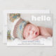 Anuncia el nacimiento de tu hijo con esta tarjeta de anuncio de nacimiento de niño personalizada moderna. Esta plantilla de diseño simple presenta una imagen en la parte frontal de la tarjeta con la palabra "hola" en tipografía blanca. A continuación, se muestra el nombre de tu bebé y los detalles de nacimiento en texto azul y gris. La parte trasera de la tarjeta es blanca. ¡Felicidades por tu nuevo bebé! Diseñado por la artista ©Susan Coffey.