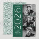 Elegante invitación de graduación con las tres fotos del graduado ubicadas a la derecha del diseño en un diseño vertical. El 2023 se exhibe con letras blancas y modernas, con un fondo verde. Personalice la moderna invitación de graduación fotográfica añadiendo el nombre del graduado y el nombre de la escuela. El diseño se invierte para mostrar un fondo geométrico verde y blanco. ¡Perfecto tanto para graduados de secundaria como universitarios!