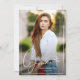 Este elegante anuncio de graduación presenta dos fotos de su graduado: una en la parte delantera y otra en la parte trasera. La palabra Graduado en un guión blanco moderno se superpone en la parte inferior junto con su nombre y año de graduación. Cambie la redacción en la parte trasera para un anuncio de graduación o invitación a la fiesta de graduación. También puede cambiar el color en la parte trasera para que coincida con la foto o el color de la escuela.