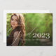 Una invitación de graduación de 2023 moderna y elegante que incluye dos fotos de la universidad o de un graduado de secundaria. Elegante, moderno guión blanco y año en un overlay junto con dos fotos del graduado. Puede ajustar la redacción de la parte posterior de la tarjeta para que ésta sea una simple invitación de graduación o una invitación a una fiesta de graduación. Un diseño de graduación elegante y sencillo para la clase 2023.