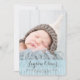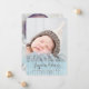 Muy moderno y elegante, este diseño es perfecto para presentar a tu pequeño y dulce hombre. Presenta una tipografía cursiva preciosa y dos grandes fotos de su bebé - una en la parte delantera y otra en la parte trasera. El frente también contiene información sobre el nacimiento del bebé, y en la parte posterior un área de texto especial para ser personalizada con los padres e información familiar.