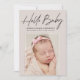 Tarjeta de anuncio de nacimiento moderna que incluye "Hello Baby" en un guión con firma negra, con el nombre de su bebé, estadísticas de nacimiento y foto mostrada debajo sobre un fondo de color claro. La tarjeta de anuncio de nacimiento de la foto se revierte para mostrar una foto adicional y un mensaje personal con fondo de taupe y punto de polka blanco.