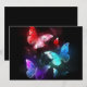 Three luminous, red, purple, green, textured, night butterflies on black luminous background.