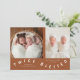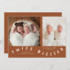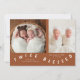 Extraordinaria tarjeta de anuncio de nacimiento con texto de tipografía que dice "bendecidos dos veces" en la parte inferior con dos fotos en la parte delantera. Puede añadir una tercera imagen en la parte posterior junto con las estadísticas de nacimiento y el mensaje. El fondo es terracota.