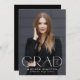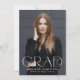 Anuncie su graduación de la escuela secundaria o universitaria con esta moderna invitación de graduación. La invitación de graduación muestra "Grad" en letras blancas de moda con el año de graduación mostrado dentro de la letra "d". Personalice la parte delantera de la invitación con la foto vertical, el nombre y la escuela del graduado. La invitación se revierte para mostrar una foto adicional mostrada dentro de un marco cuadrado blanco con el mensaje que se muestra a continuación.