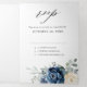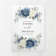 Invitación Tri-Fold de boda floral azul polvoriento que incluye un elegante ramo de azul marino, azul real, blanco, dorado, champán marfil, rosa color rosa, capullos de flores de ranunculus y hojas de eucalipto verde salvia y ramo de acuarela elegante. Por favor, contácteme para cualquier ayuda en personalización o si necesita cualquier otro producto con este diseño.